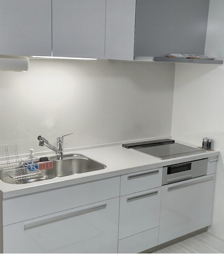 凹凸の少ないシステムキッチン、壁はタイルからパネルにかわることでお手入れがしやすくなりました!