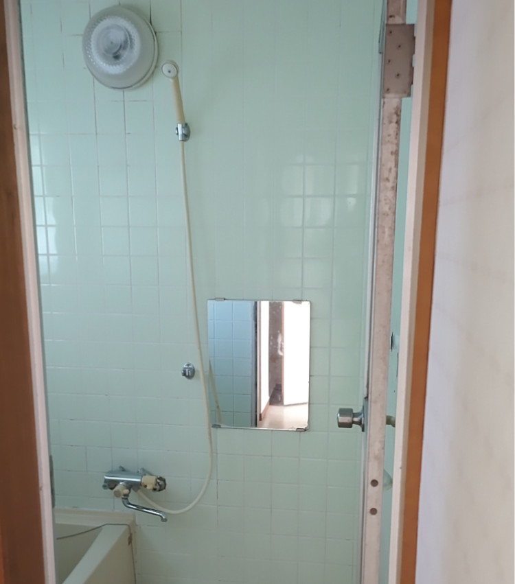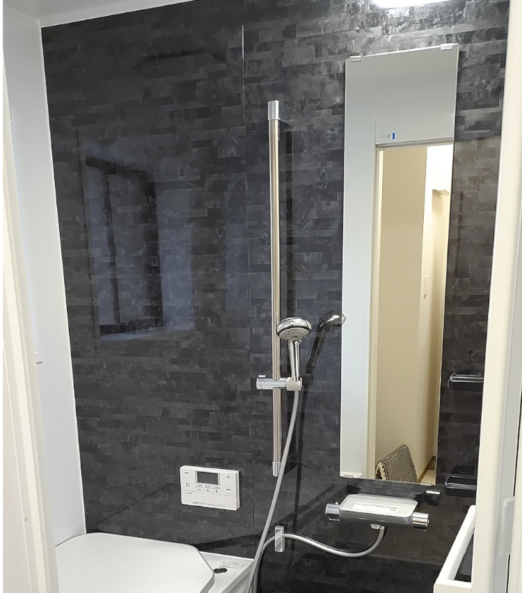 縦長の鏡とシャワーの位置を調整できるスライドバーを付けて使いやすくなりました。
