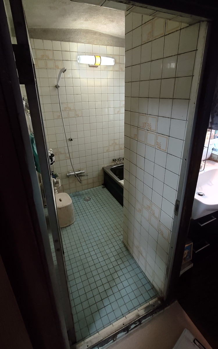 洗面化粧台があるため入口が狭く、タイルで冷たい浴室でした。