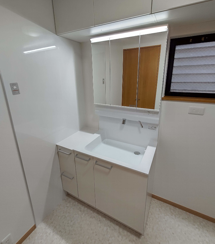 洗面化粧台の位置を変更して、棚付きのウォールキャビネットを設置することでしっかり収納ができるようになりました!